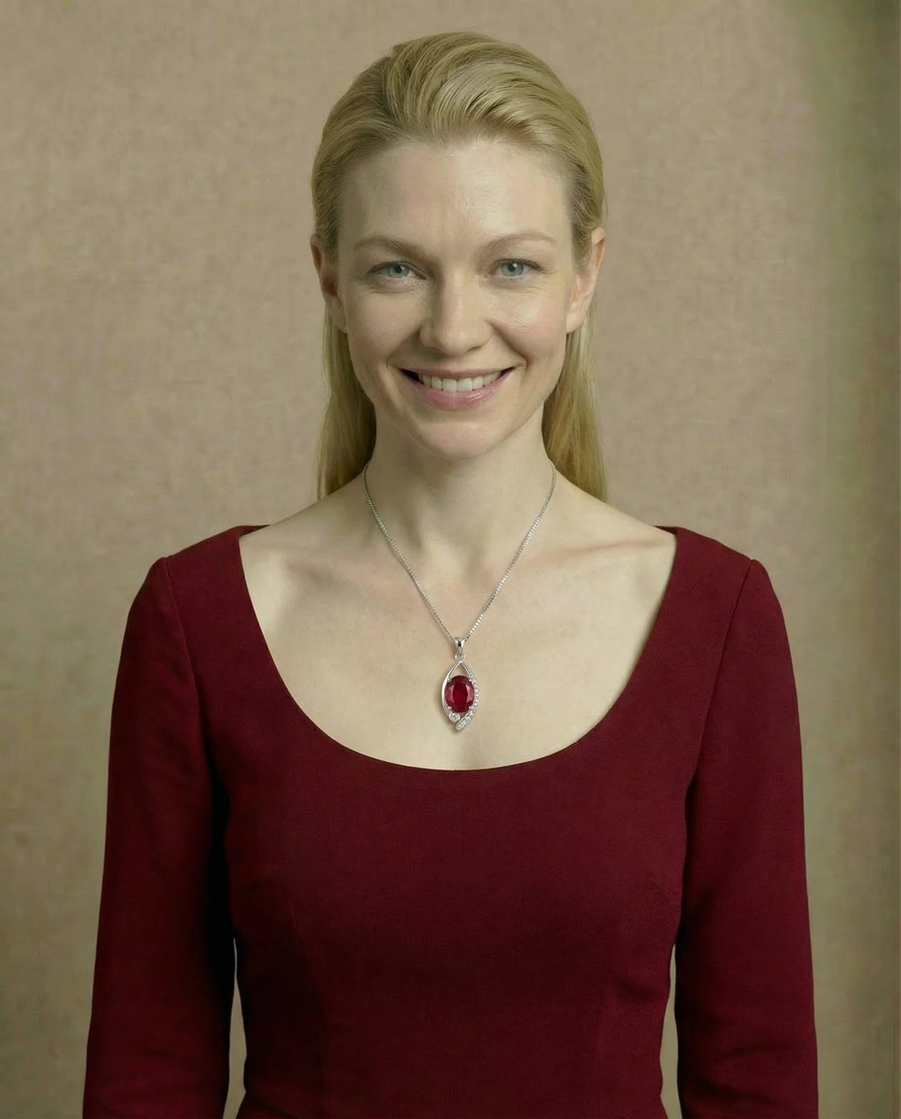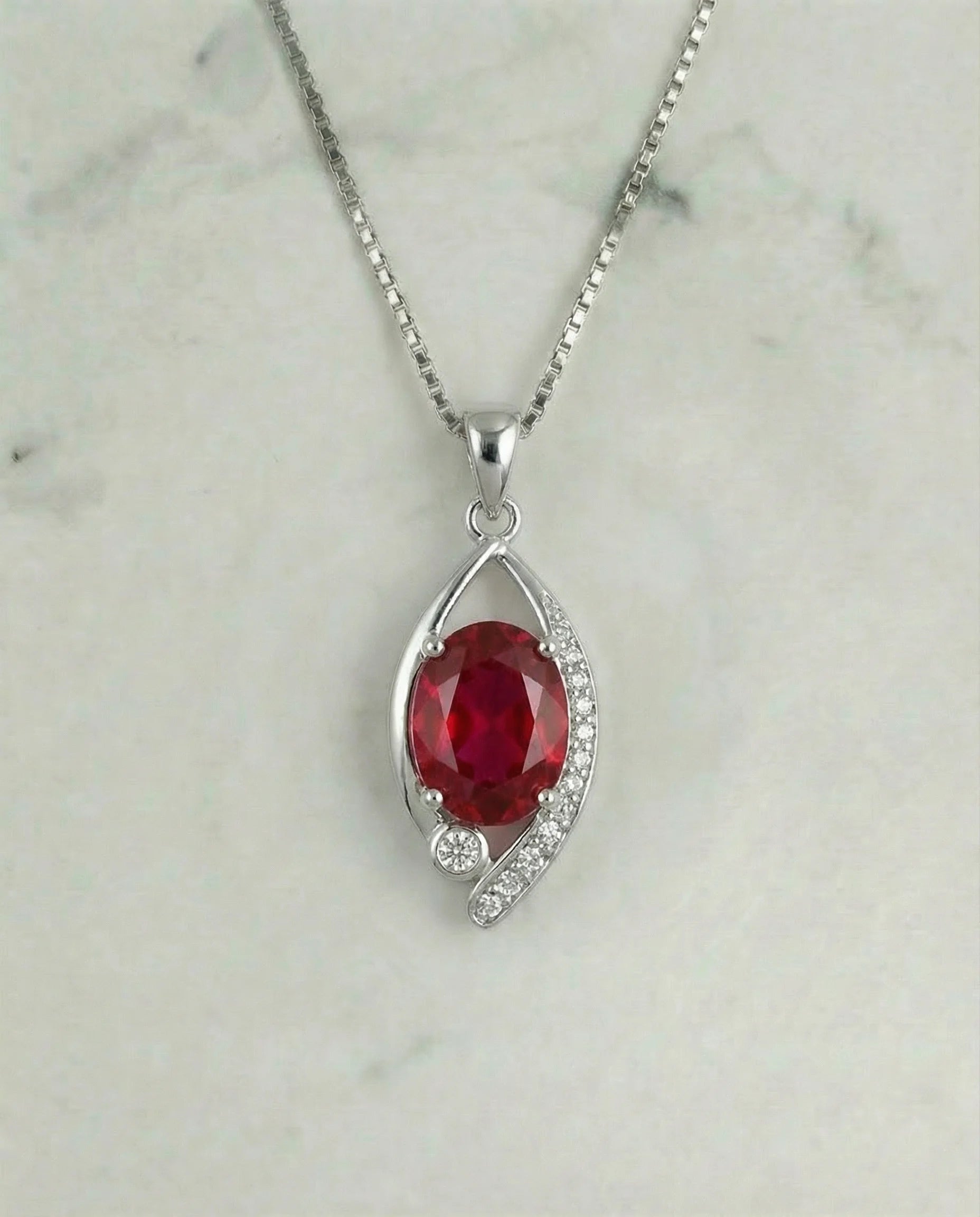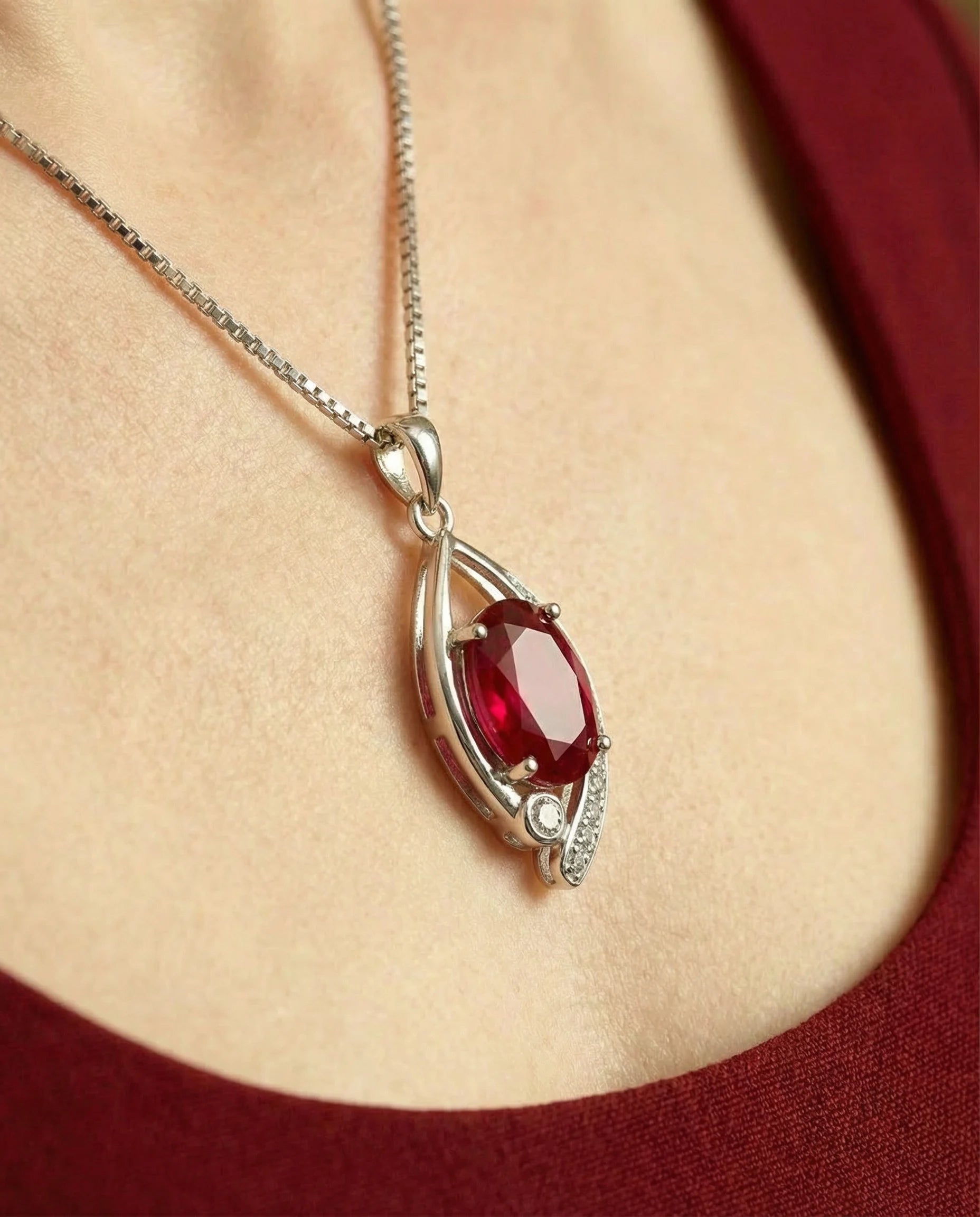 Descripción: Este collar con colgante de granate está diseñado para hacerte sentir como una princesa. Está inspirado en las joyas de la realeza británica, como la princesa Diana y la princesa Kate. El granate rojo vibrante de talla ovalada de 2.6 ct y los 11 diamantes simulados en el lateral están engastados en plata pura al 92,5 % y vienen con una cadena de plata fina de 45 cm.
